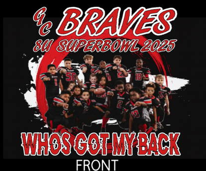 Who's got their back? Let's go Braves! 8U Super Bowl 2025 in tee or hoodie your choice. All orders will be on a black tee or hoodie. All orders must be completed by 5pm cst 10/30/25 in order to be guarenteed delivery by/on 11/01/25. Thank you!